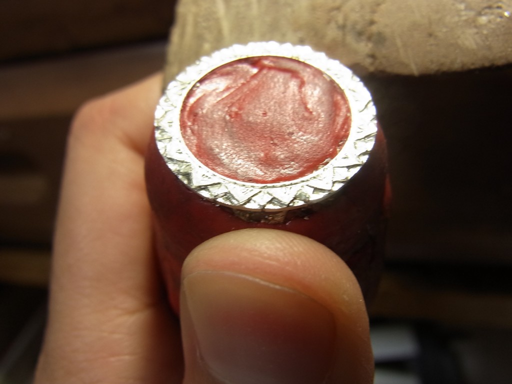 石留は金属を倒して石を留める技術。日本もヨーロッパも大まかに留める工程には変わりはありませんが使う道具や留めた後の見た目の印象が違います。ヨーロッパの石留は、洋彫り用のタガネで石を金属に留めていきます。石留用のタガネと彫り用のタガネは刃の研ぎ方が微妙に違うのでそれぞれ別々に石留用、彫り用と使い分けています。