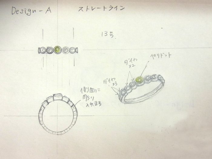 デザインをお選び頂きました。中央にはお誕生石のペリドットを配置します。