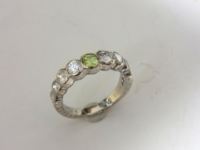 今回は大きめのダイヤ6粒とペリドットを覆輪留めで留めて残りのダイヤは腕の部分に直接留める彫り留めで留めていくことになりました。素材はK18ホワイトゴールドでお作りしています。今度は歪んでしまわないように、腕の部分はしっかりと太めに作りました。