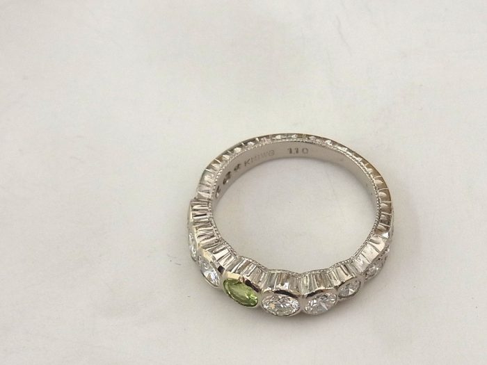 そして、完成したお品物がこちらです。今回ピアスのダイヤを加えたのでトータル1.1ctにアップ。キラキラ輝いて迫力がありとても美しいです。ペリドットを中心に腕に向かって、ダイヤの大きさが丁度よいグラデーションになっています。