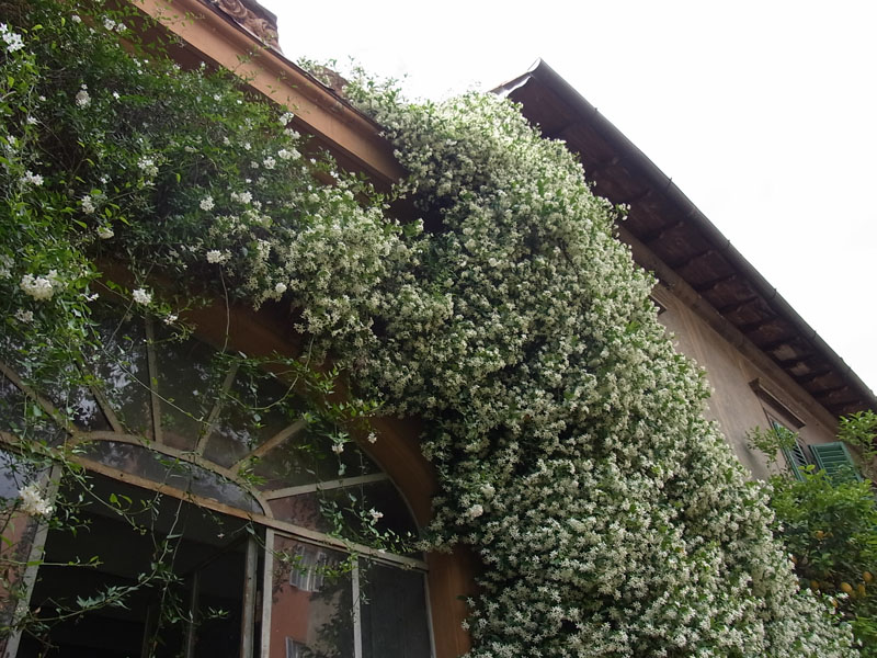 建物を覆い尽くしてしまうくらいの勢いのジャスミン。とても良い香りがただよいます。