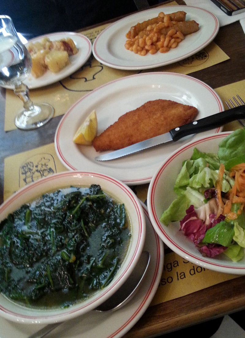 黒キャベツのスープ(Zuppa di cavolo nero)と、タラのカツレツ(Cotoletta di merluzzo fritto)とサラダ(Insalata mista)。