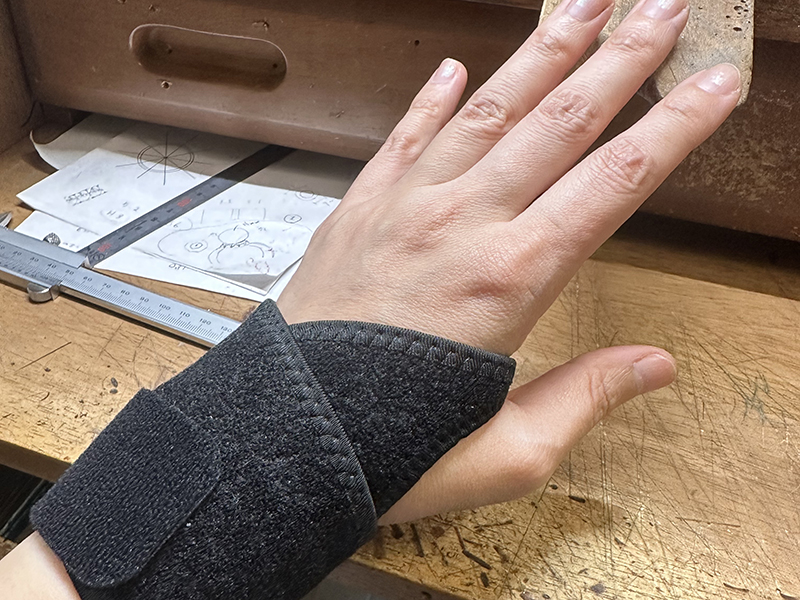 余談ですが…最近彫りを入れていると手が腱鞘炎・ばね指っぽくなることが多いので対策としてこんなサポーターを買ってみました。ちょっとは楽になったかな・・・。でも結局邪魔になって時々外したり、疲れたらまた着けてみたいな感じ。フィレンツェ彫りは自分の手の力だけで彫るので結構手に負荷がかかることが多いんですよね。