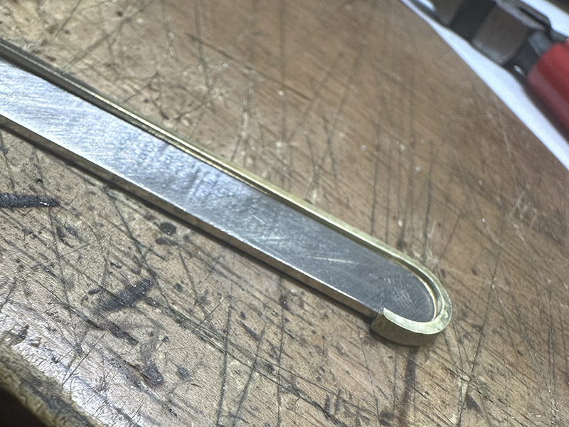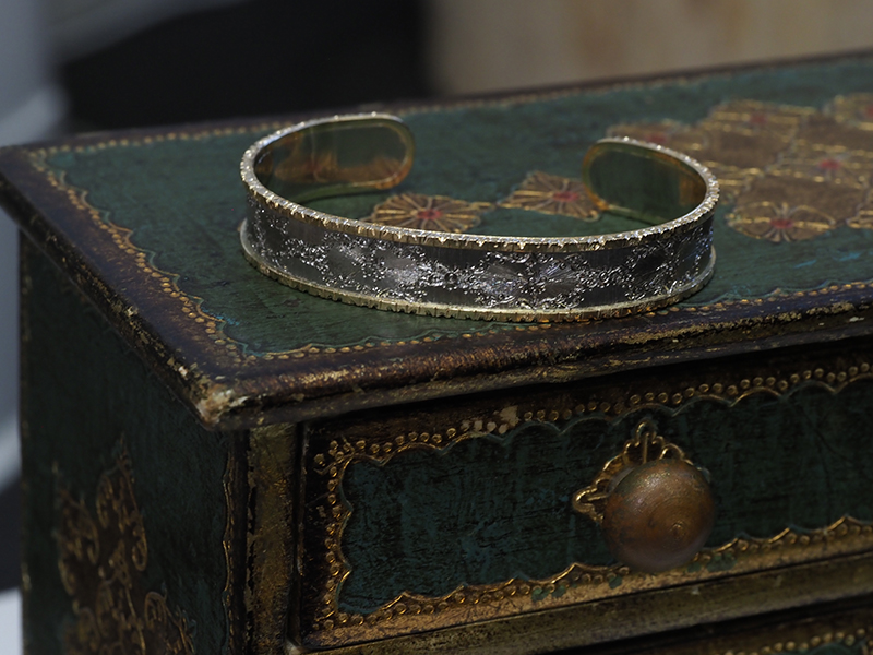 バングルにフレームという出来上がった形から見るとシンプルな構造のように思うのですが、制作するうえではフレームをぐるっと一周、本体板面にロウ付け(溶接)をする作業が必要になります。リングと違ってバングルの側面は、長さもとても長くなってきますので隙間なくグルっと一周ロウ付けをするには少しの工夫が必要だったのです。