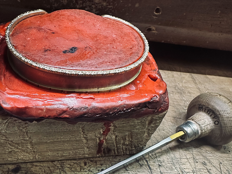 まずは側面から彫刻していきます。イタリアのヤニ、チェララッカにバングルを固定して彫刻します。彫りを入れると金属がキラキラしてきて雰囲気がガラッと変わりますよー。つるっとした金属とは全く別の質感になります。表が終わったらヤニから外して再びヤニに再固定、反対側も彫刻していきます。