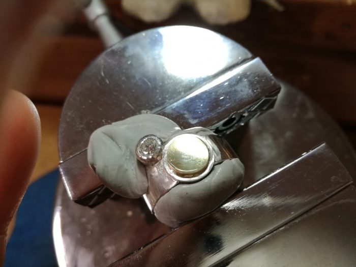 全てを組み立てたら、まずはダイヤモンドを留めてから彫りをいれていきます。