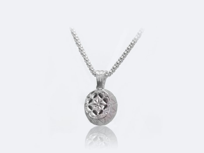 ペンダントの裏面には透かし彫りをいれて、透かしの中央にも模様を彫刻しています。見えない部分への贅沢なデザインが施されています。