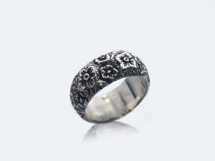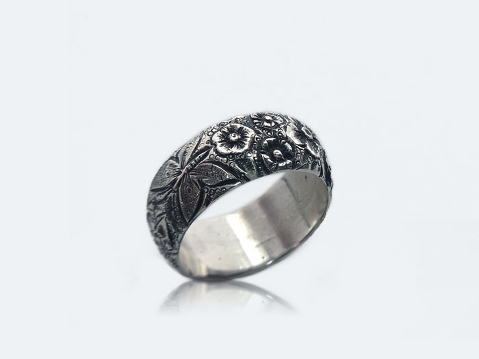 シンプルな甲丸リング、そのリングにぐるっと一周花や葉っぱ・蝶々などの自然モチーフを彫刻しました。