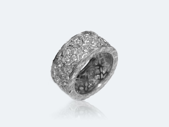 イタリアフィレンツェで留学中に学んだ、透かし彫り(Traforo Forentino)とフィレンツェ彫り(Incisione)を施したフィレンツェスタイル(Stile fiorentino)のリングです。